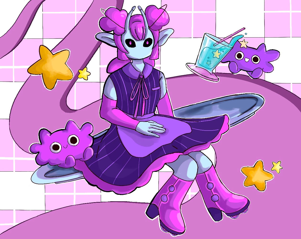 (WIPPPPPP) In the cold, unforgiving vacuum of space, hospitality is hard to come by. Luckily, a quaint diner floating amidst the stars is here to serve up some classic alien comfort food; that is, as long as everything can stay on the plate.Play as an alien waitress in this galactic game of balancing plates and rollerblading around from patron to patron, doing your best to appease impatient customers! Use the arrow keys and WASD to navigate tipping trays and glide with ease across the linoleum tiles of this establishment.Remember, the fate of the diner rests on your shoulders; after all, we pride ourselves on our Stellar Service!Made for the 2025 TritonWare Game Jam!